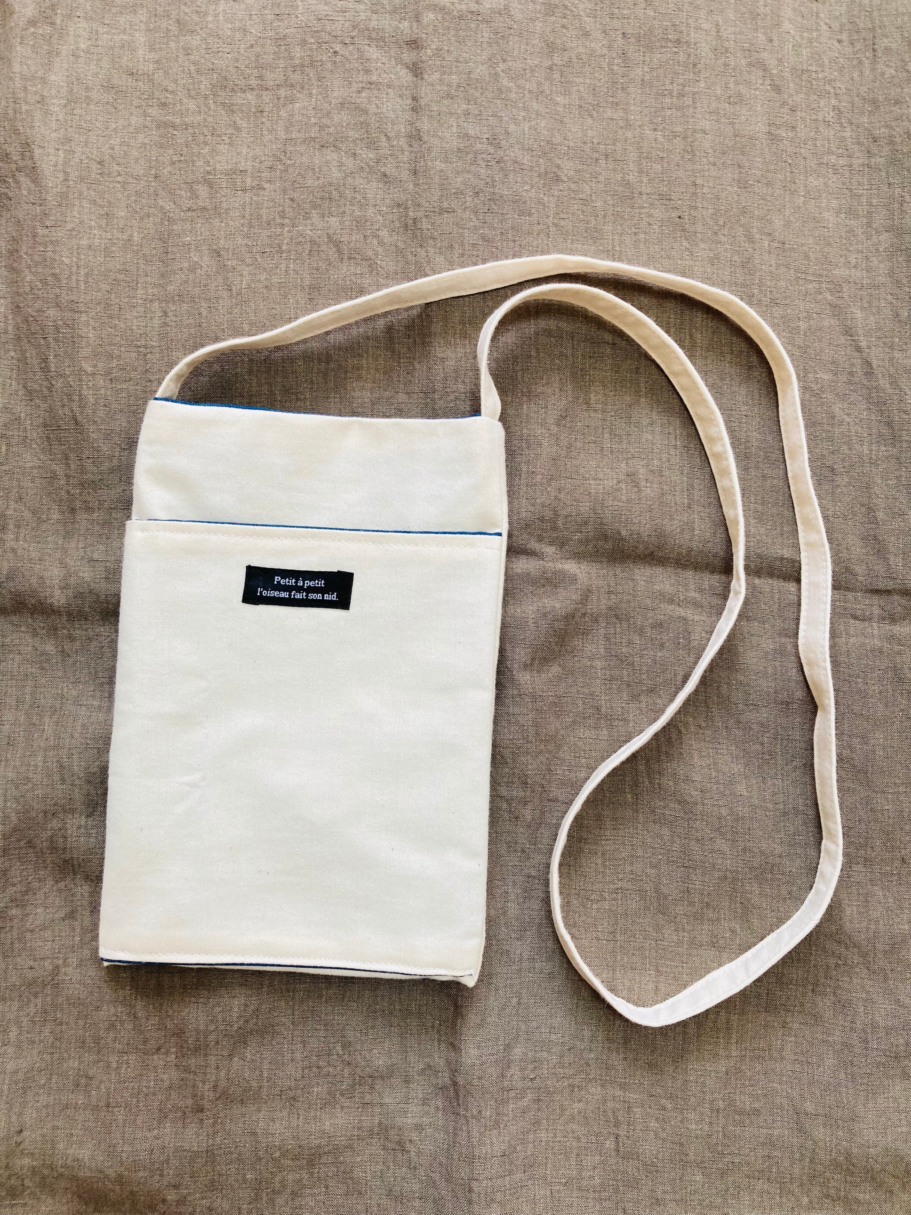 スマホとお財布とハンカチが入る普段使いのシンプルサコッシュ。表地はオフホワイトの11号帆布。裏地はセイラーブルーのオックスフォード生地。