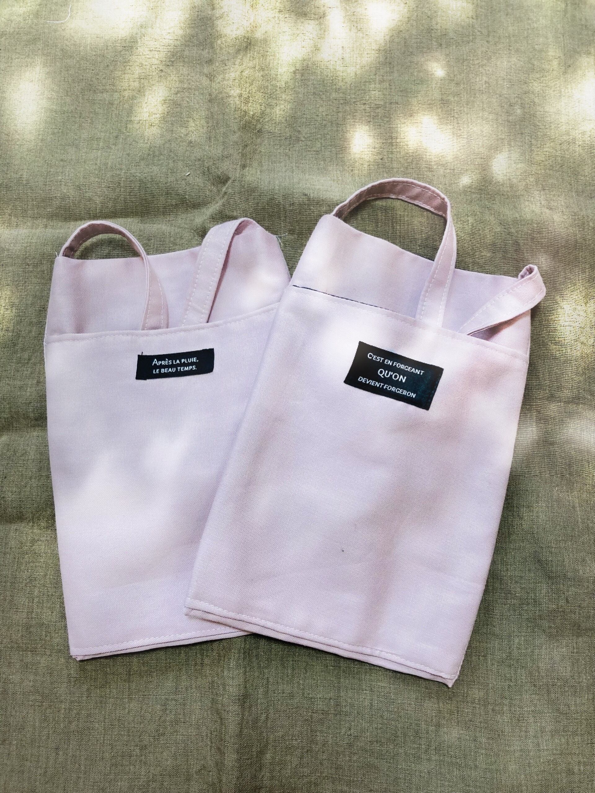 スマホとお財布とハンカチが入る普段使いのシンプルサコッシュ。表地も裏地も生地はオックスフォードで、表はドーンピンク、裏地はブラックです。