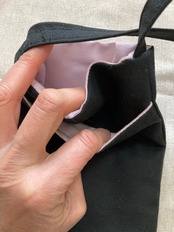 スマホとお財布の入る普段使いのシンプルサコッシュ。表地は11号の黒の帆布、裏地はドーンピンクのオックスフォードを使用。