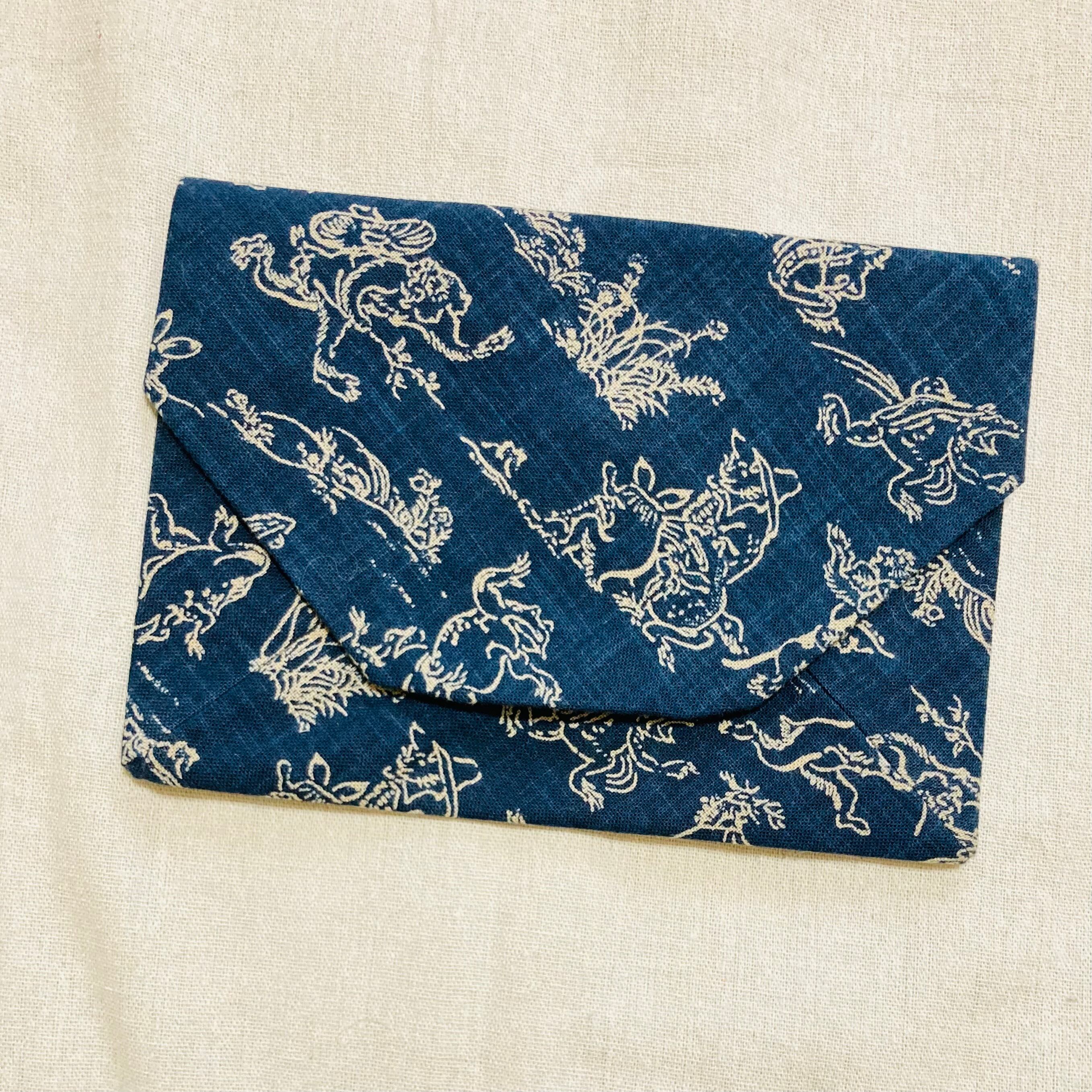 茶道のお道具を入れるのに使う数奇屋袋です。表地裏地ともに綿100%。鳥獣戯画の和柄布です。マグネットホックつき。 表地は芯を貼ってあるので少しふっくらとしています。